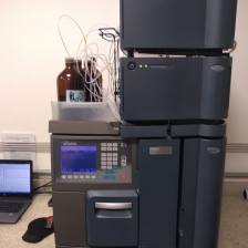 Cromatógrafo a líquido com sistema de distribuição quarternária de solventes. Marca: Waters, modelo: Alliance e2695. Equipado com forno para coluna e injetor automático com carrossel para 120 amostras. Sistemas de detecção em série por arranjo de fotodiodos (PDA) e por índice de refração (RID). HPLC-DAD-RID. Colunas cromatográficas disponíveis: C18 (compostos hidrofóbicos) e HILIC (compostos polares).