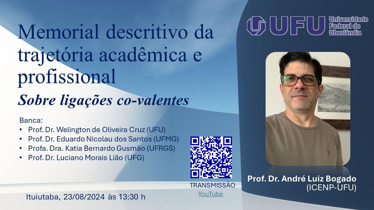 O ICENP divulga Defesa de Memorial para promoção a professor titular do professor do curso de química André Luiz Bogado.
