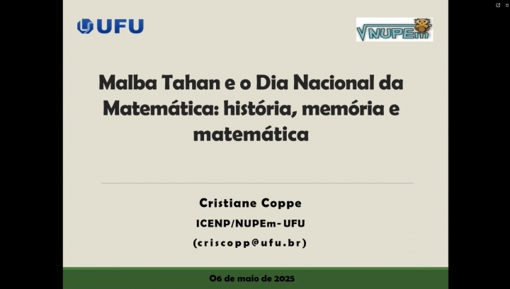A exposição fez parte das atividades em torno do Dia Nacional da Matemática, celebrado em 6 de maio, data de nascimento de Malba Tahan. Além da exposição, a professora Cristiane Coppe também participou, como palestrante convidada, do Fóruns PPGEMAT (Programa de Pós-Graduação em Ensino de Matemática da Universidade Federal do Rio Grande do Sul – UFRGS). Sua palestra teve como tema “Malba Tahan e o Dia Nacional da Matemática: história, memória e matemática”, e destacou o papel da educação matemática como instrumento de preservação cultural e social.